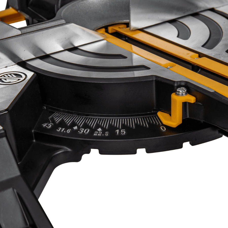 Gracias a su doble corredera, la cabeza de corte se desplaza a lo largo de la pieza, permitiendo cortes más largos y complejos sin comprometer la precisión. La mesa giratoria ajustable de -45° a +45° y el corte en bisel a 45° por ambos lados brindan versatilidad para cualquier tipo de proyecto, indicando el ángulo exacto en la escala de la corredera.