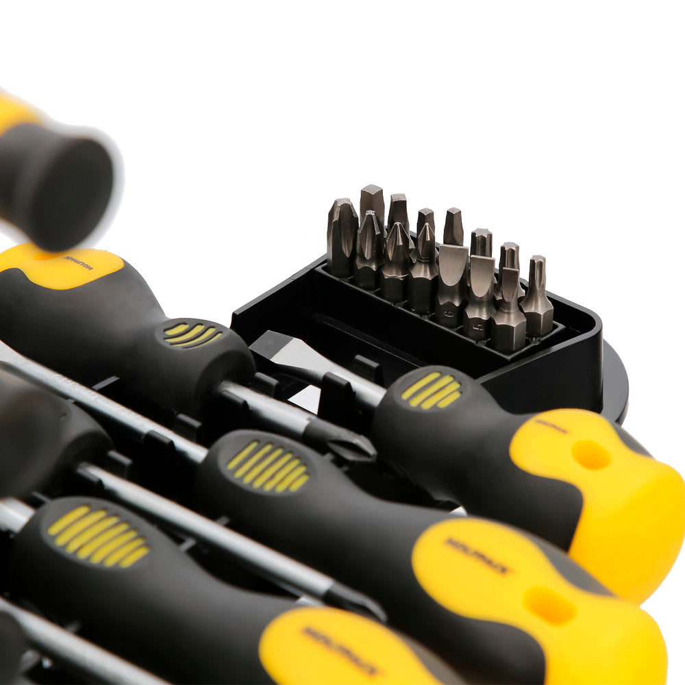 El Juego de Destornilladores y Puntas 30 piezas con soporte es la opción ideal para quienes buscan un kit completo y ordenado para trabajos de reparación, montaje y mantenimiento. Con una combinación de destornilladores de precisión, destornilladores planos, Phillips y puntas intercambiables, este set cubre desde pequeñas reparaciones electrónicas hasta tareas de bricolaje en el hogar.